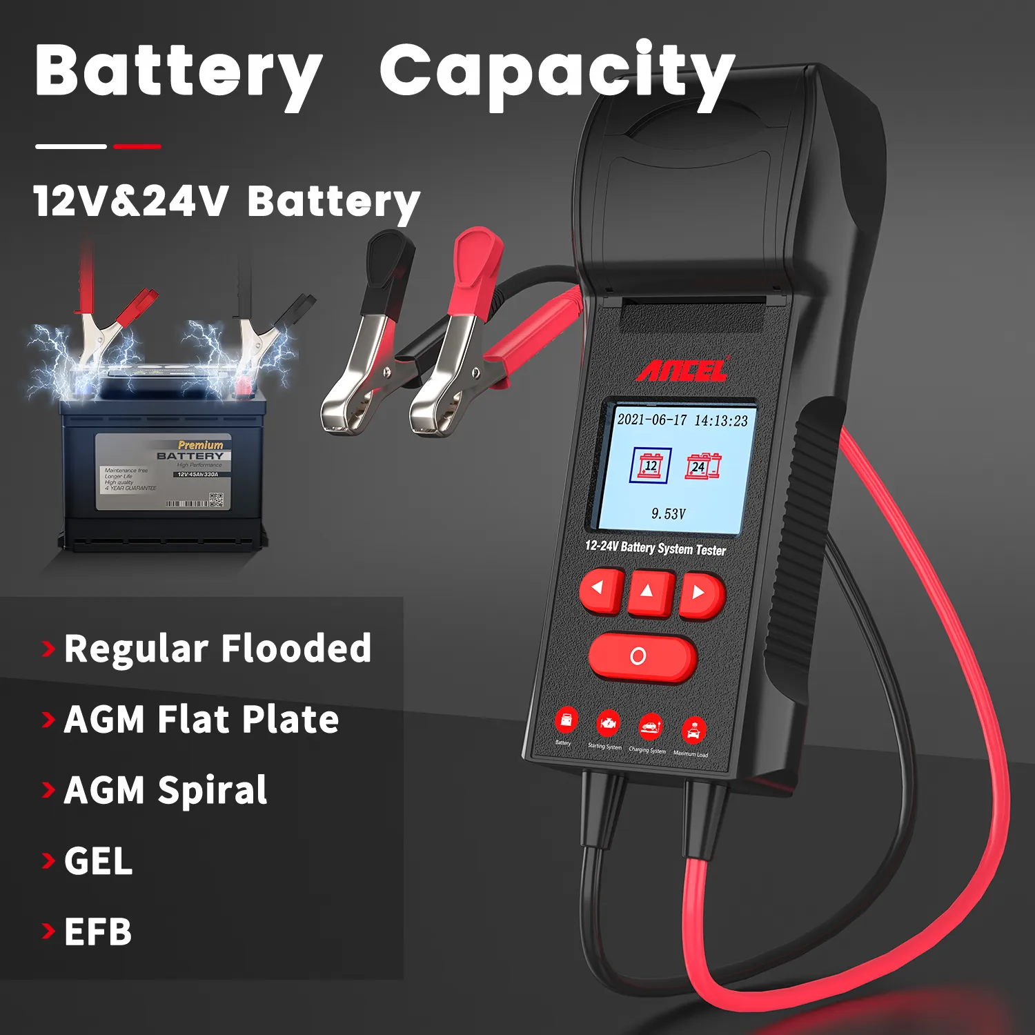 works on 12 volt & 24 volt lead-acid batteries including regular flooded, AGM flat plate, AGM spiral, GEL and EFB batteries with the test range (100-2000 CCA). Compatible with cars, motorcycles,